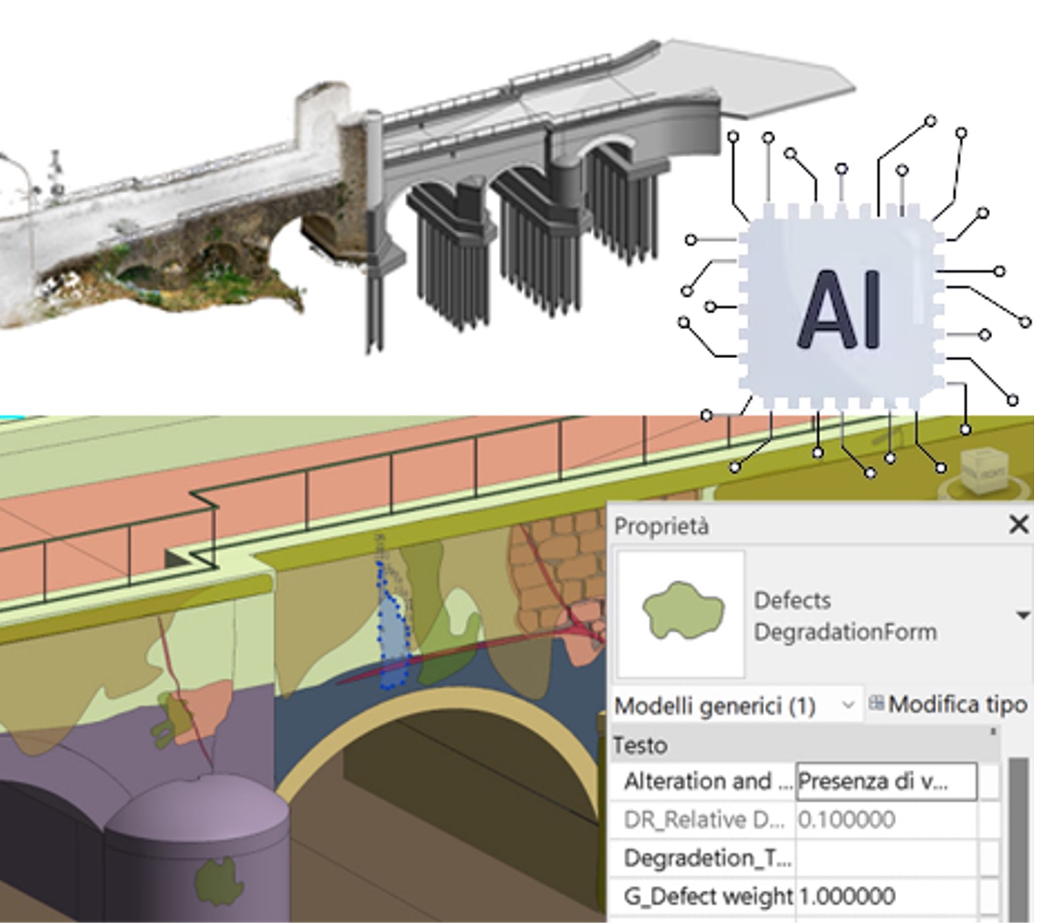 Il progetto di ricerca BEDD ha come obiettivo primario la definizione di una metodologia innovativa per il monitoraggio delle infrastrutture, attraverso ispezioni visive automatizzate, per valutare il degrado superficiale e i danni dei ponti, con particolare attenzione a quelli storici in muratura. Inoltre, il progetto mira a realizzare un modello, declinando il termine in base alle discipline coinvolte, che integri quello matematico IA con quello parametrico HBIM. Questo rappresenta il punto di forza del progetto poiché l’integrazione di procedure BIM, per la rappresentazione digitale e il collegamento topologico delle informazioni, con le tecniche avanzate di IA, finalizzate a realizzare ispezioni non invasive, permette di effettuare una manutenzione predittiva e garantire una gestione efficiente delle opere grazie alla creazione di un modello predittivo.